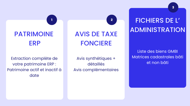 WIM utilise trois sources de données essentielles qui doivent être intégrées pour pouvoir gérer votre campagne : les données patrimoniales, les avis fiscaux, et les données cadastrales.