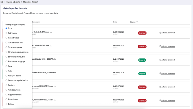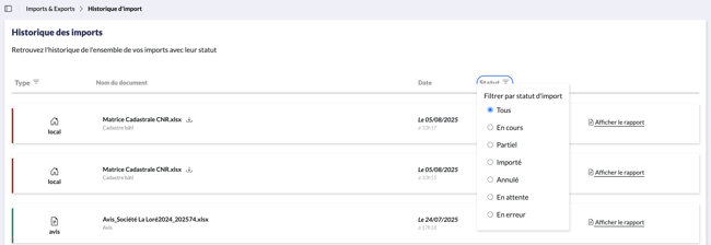 Vous pouvez utiliser les filtres pour sélectionner des imports spécifiques par type, date, ou statut. Par défaut, ils sont affichés du plus récent au plus ancien.