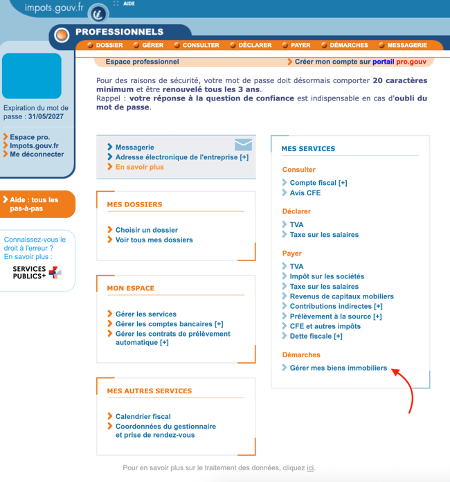 - Cliquez sur le bouton Gérer mes biens immobiliers.