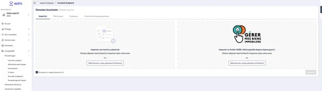 Une fois l’adhésion au service GMBI (Gérer mes biens immobiliers) effectuée depuis votre espace professionnel sur impots.gouv.fr, vous avez la possibilité de télécharger le fichier contenant la liste de vos biens immobiliers. Ce fichier, au format CSV, est indispensable pour alimenter WIM, notamment pour obtenir des données provenant de l’administration fiscale et pour anticiper l’étape de rapprochement des invariants.