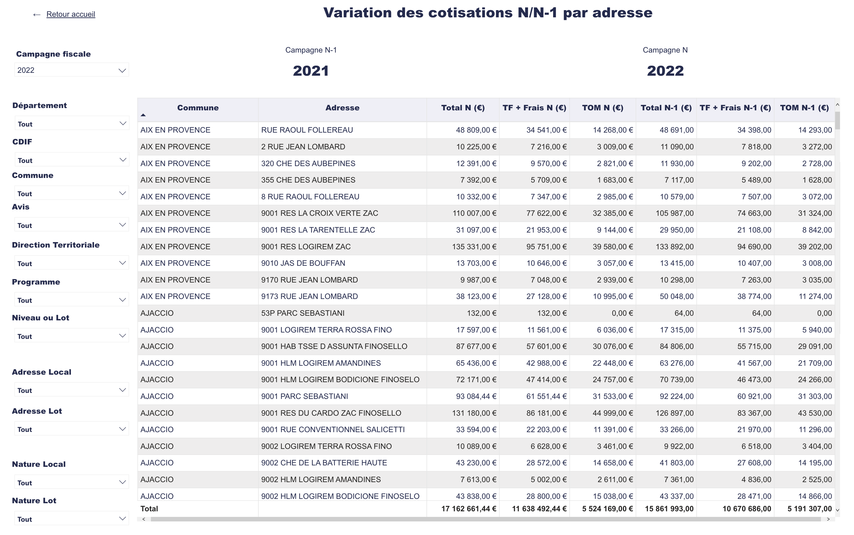 Important : Si une adresse affiche des montants vides sur une année, c'est que l'adresse n'est pas imposée sur l'année concernée.