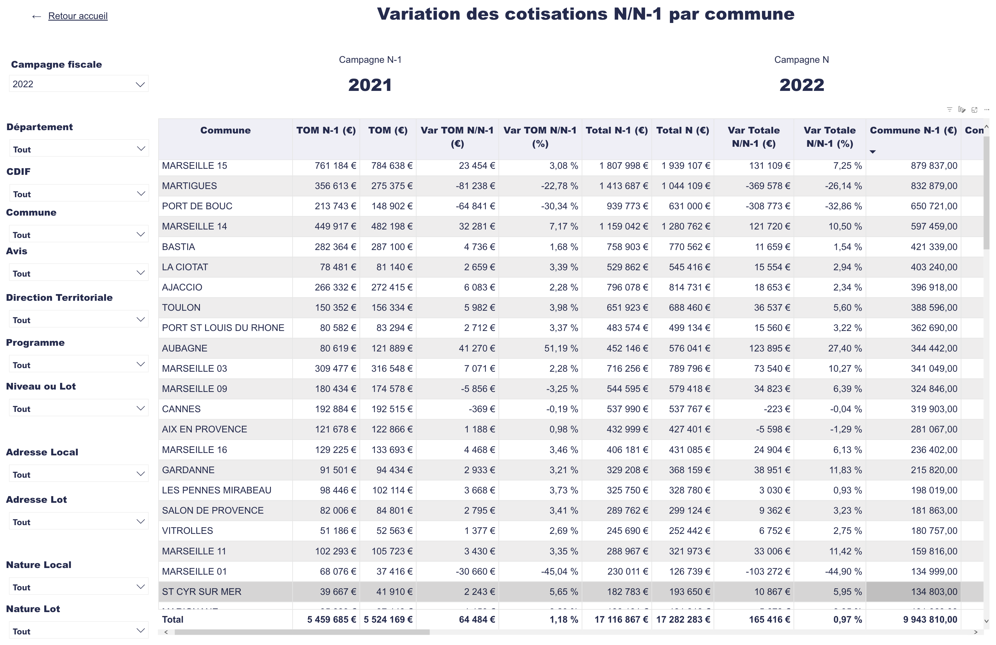 En triant sur la donnée Var Totale N/N-1 (%), on identifie les communes où l'évolution des cotisations est la plus importante ou au contraire la moins importante.
